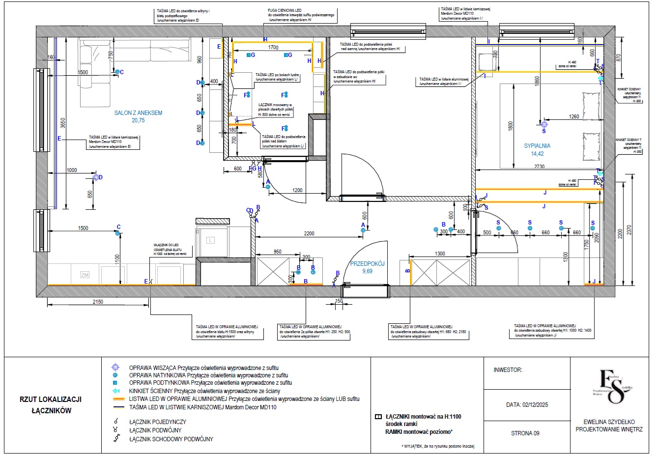 - Projekt lokalizacji łączników z naniesionymi i zwymiarowanymi punktami oświetleniowymi, wraz z podziałem na strefy oświetleniowe i obwody.Wydzielone strefy do pracy biurowej, do odpoczynku i relaksu, czy do gotowania wymagają innych rozwiązań.