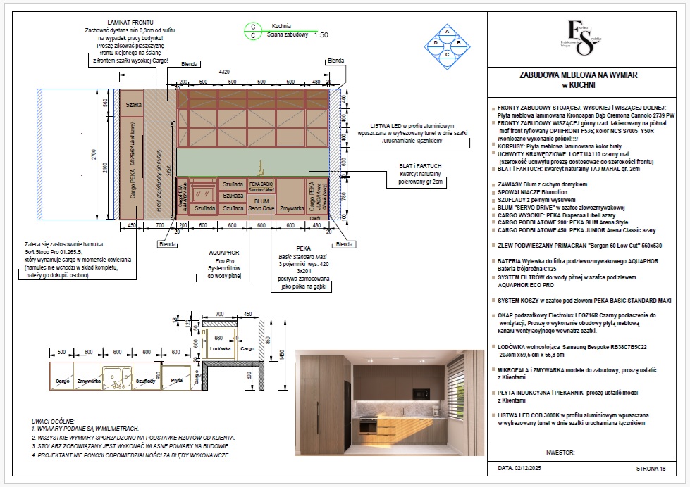 Specyfikacja mebli wraz z wymiarami każdego detalu i dokładne opisy zastosowanych materiałów. Dzięki niej w szybki i wygodny sposób zrobisz wyceny u poszczególnych stolarzy. Rysunki techniczne stanowią wartościowy i pomocny element każdego projektu i skracają proces remontowy. Będąc precyzyjną instrukcją dla wykonawców, ułatwiają im życie, ponieważ nie muszą niepokoić Cię każdą sprawą i zasypywać tysiącami pytań. Wszystko czego potrzebują znajduje się na rysunkach, które im przekażesz. Tobie zaś pozwalają na kontrolowanie całego przedsięwzięcia ze spokojną głową.